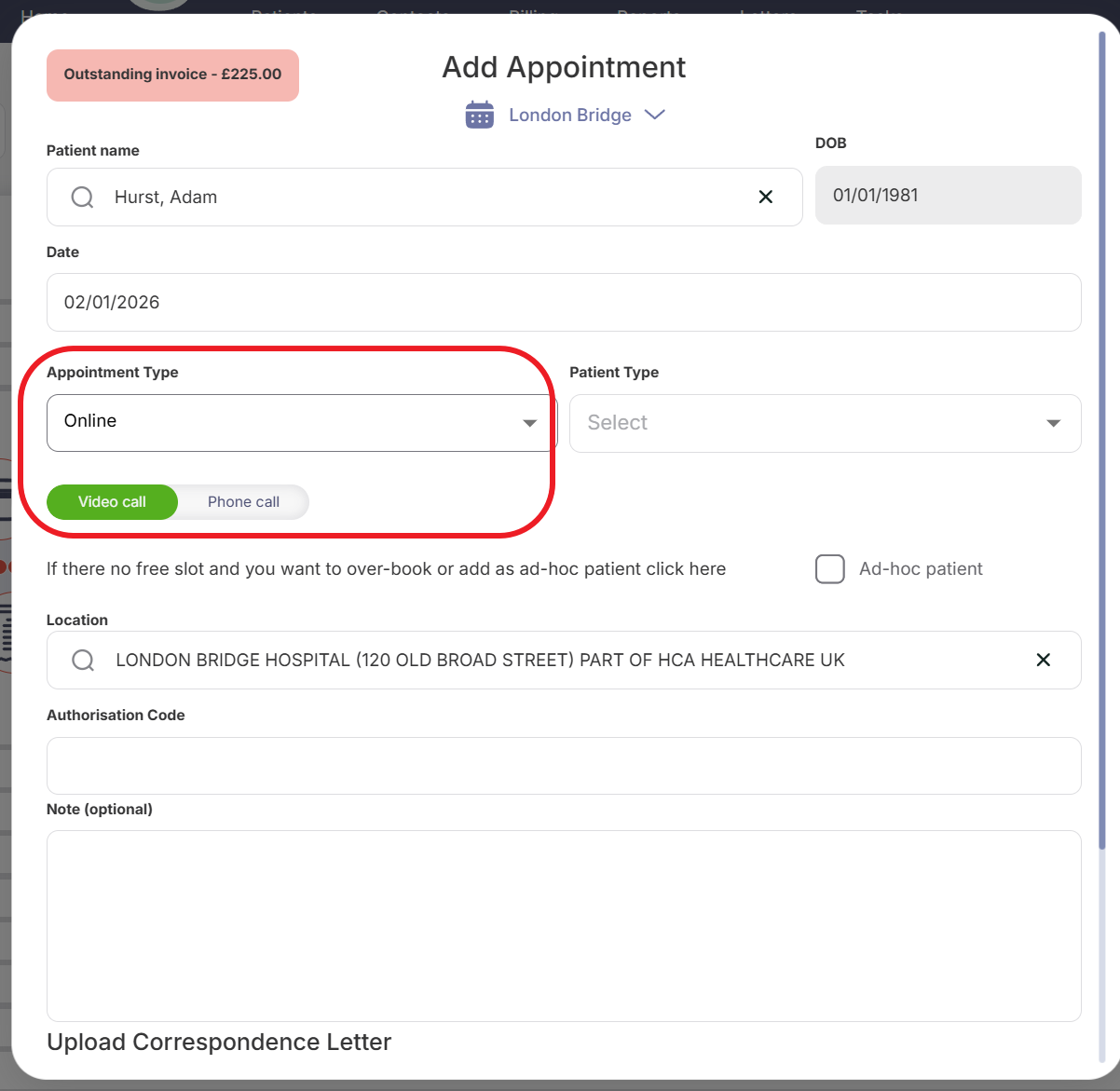 If Video appointment is selected, the appointment will be created as a secure video consultation.
