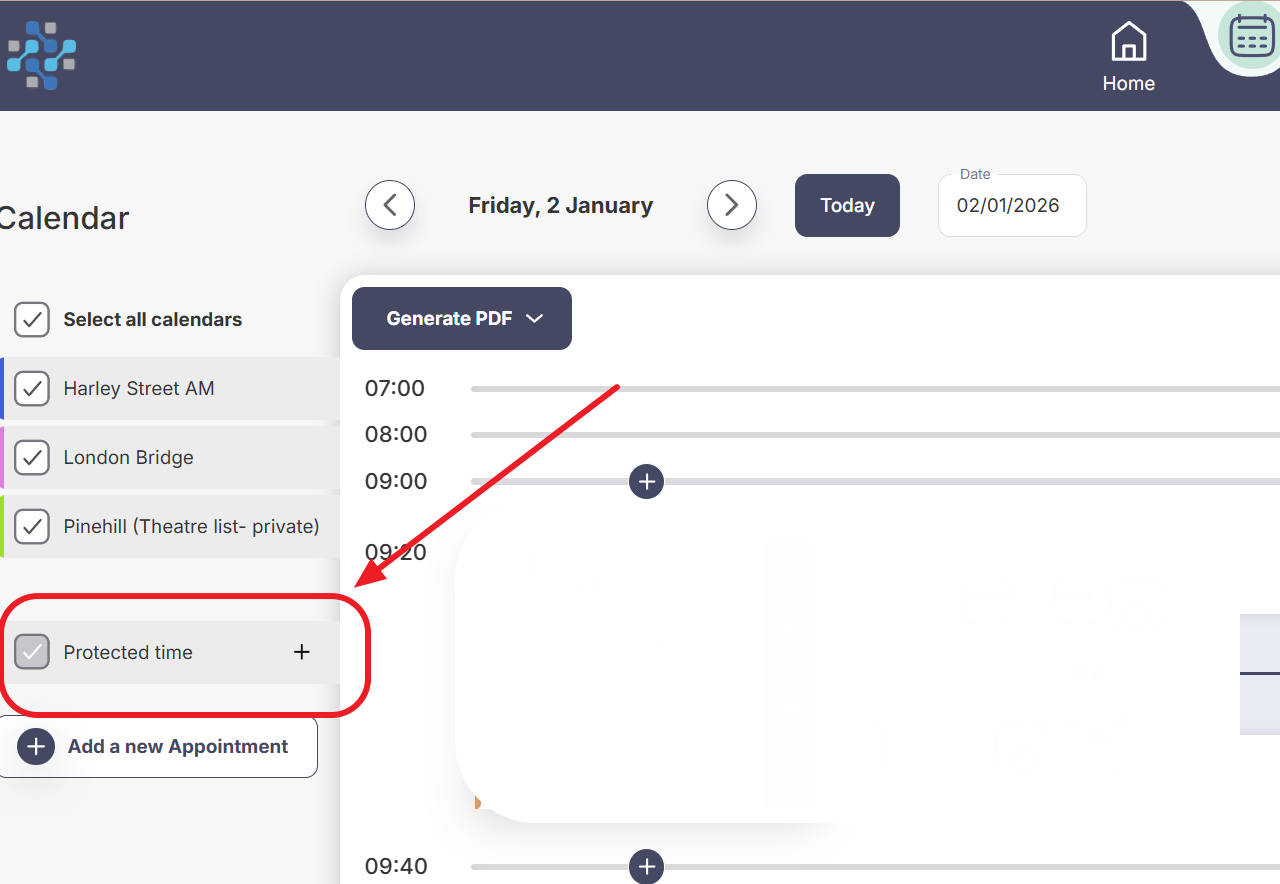 Protected time ensures that all administrative staff have clear visibility of clinician availability, helping them manage bookings accurately and efficiently.